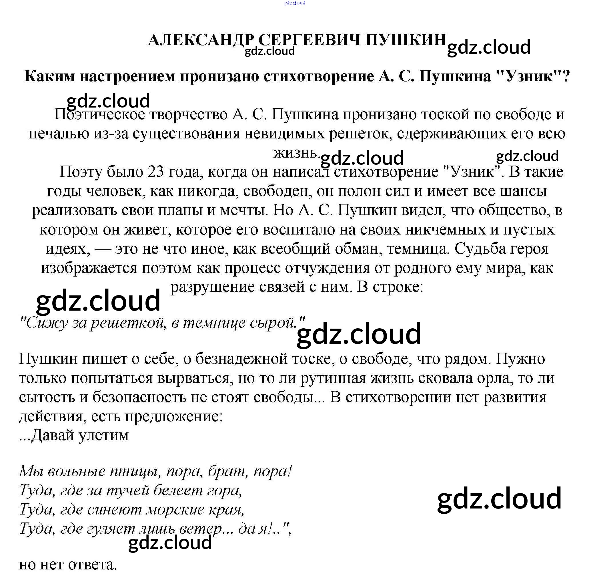 Ответ на задание Каким настроением пронизано стихотворение А. С. Пушкина "Узник"? Сочинения Литература за 5, 6, 7, 8, 9, 10 (пятый, шестой, седьмой, восьмой, девятый, десятый) класс Белик, Музычук 2017