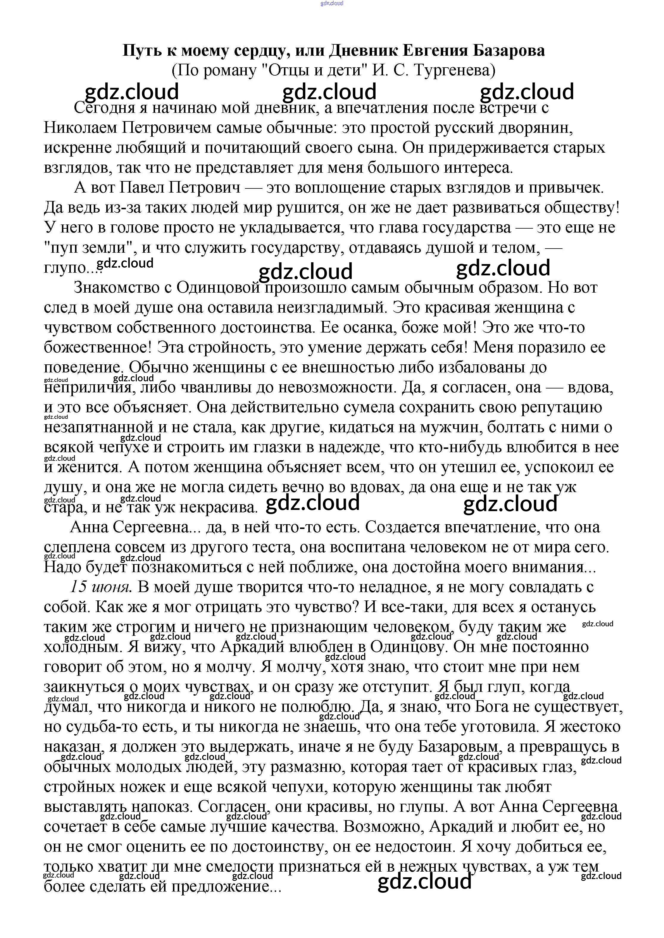 Ответ на задание Путь к моему сердцу, или Дневник Евгения Базарова (По роману "Отцы и дети" И. С. Тургенева) Сочинения Литература за 5, 6, 7, 8, 9, 10 (пятый, шестой, седьмой, восьмой, девятый, десятый) класс Белик, Музычук 2017