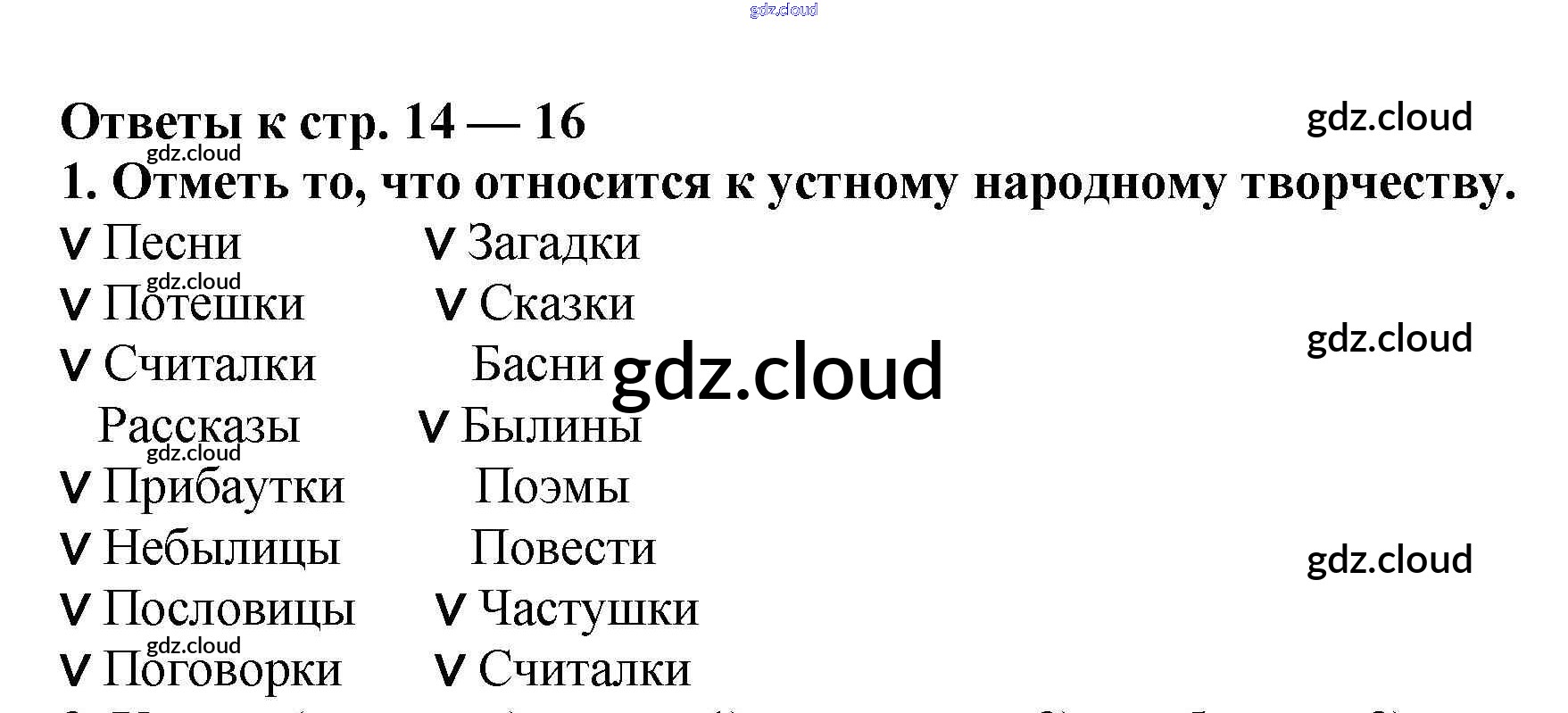 Ответы. Проверочная работа по теме «Устное народное творчество» (страницы 14-16) по Литературе 2 класс Рабочая тетрадь Кутявина ВАКО
