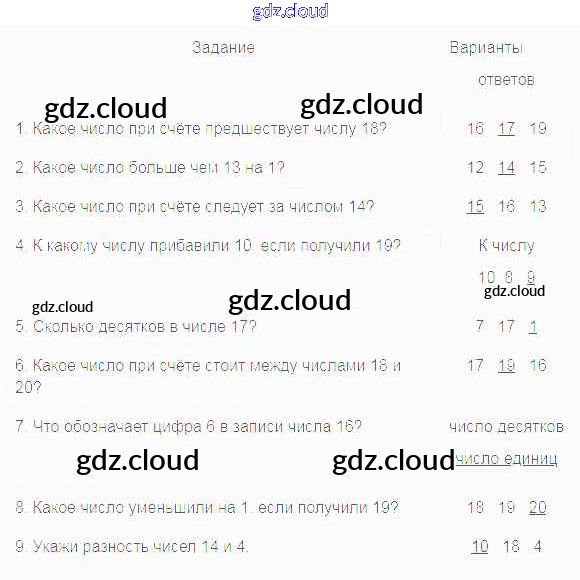 Выбери правильный ответ и подчеркни его. Варианты ответов К числу 10 8 9 число десятков число единиц