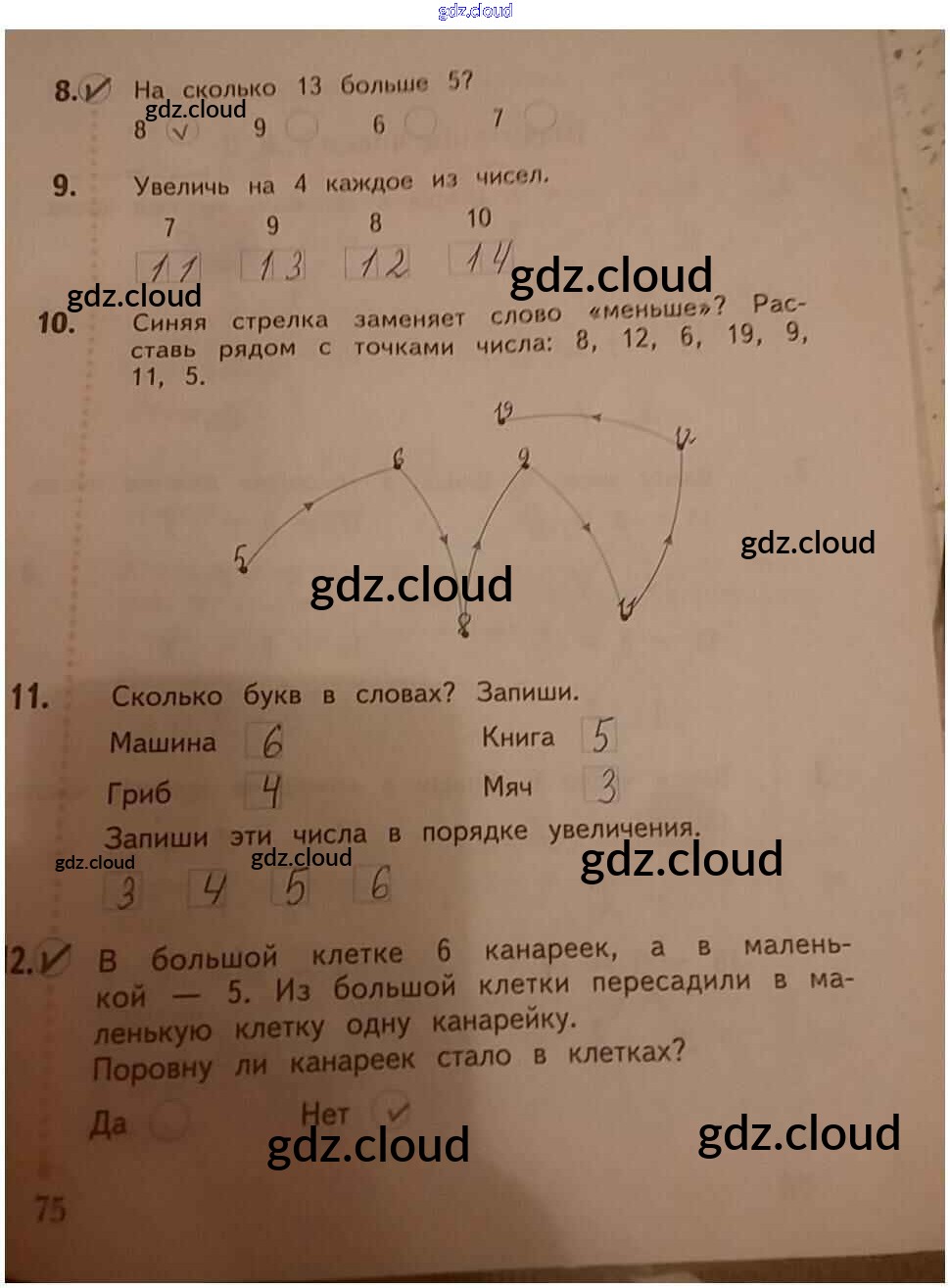 Ответ на задание 75 Рабочая тетрадь Математика за 1 (первый) класс Кочурова Начальная школа XXI века 2020