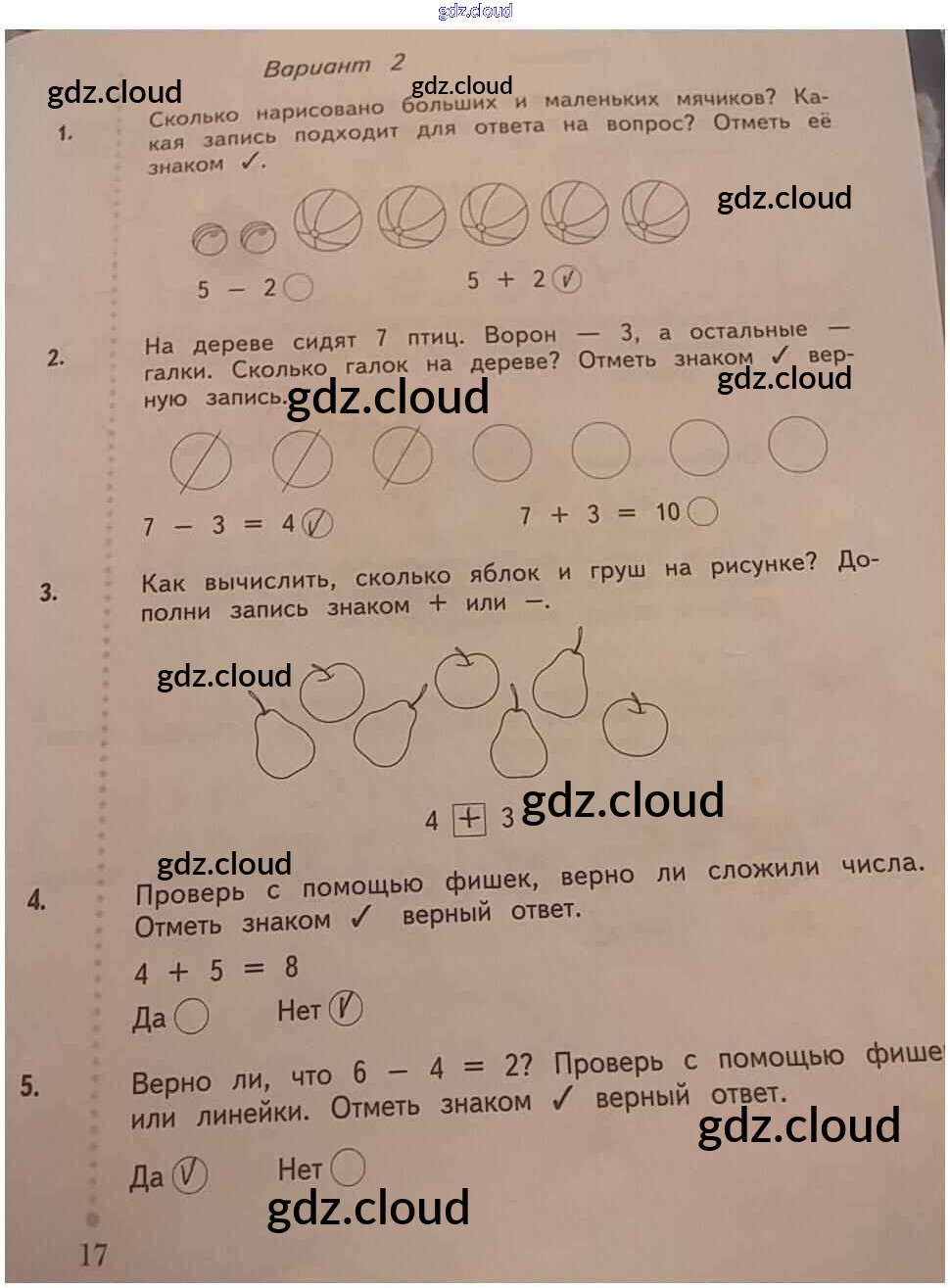 Ответ на задание 17 Тетрадь для проверочных работ Математика за 1 (первый) класс Рудницкая Начальная школа XXI века 2020
