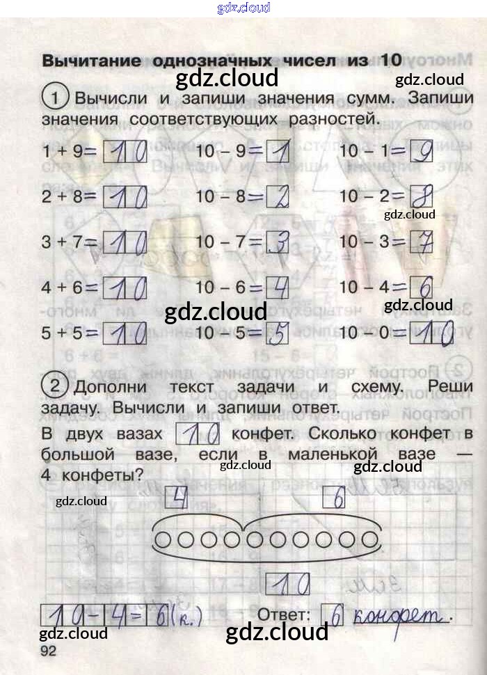 Ответ на задание 92 Тетрадь для самостоятельной работы Математика за 1 (первый) класс Захарова, Юдина Перспективная начальная школа 2016 Часть 1, 2