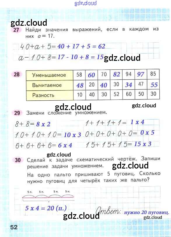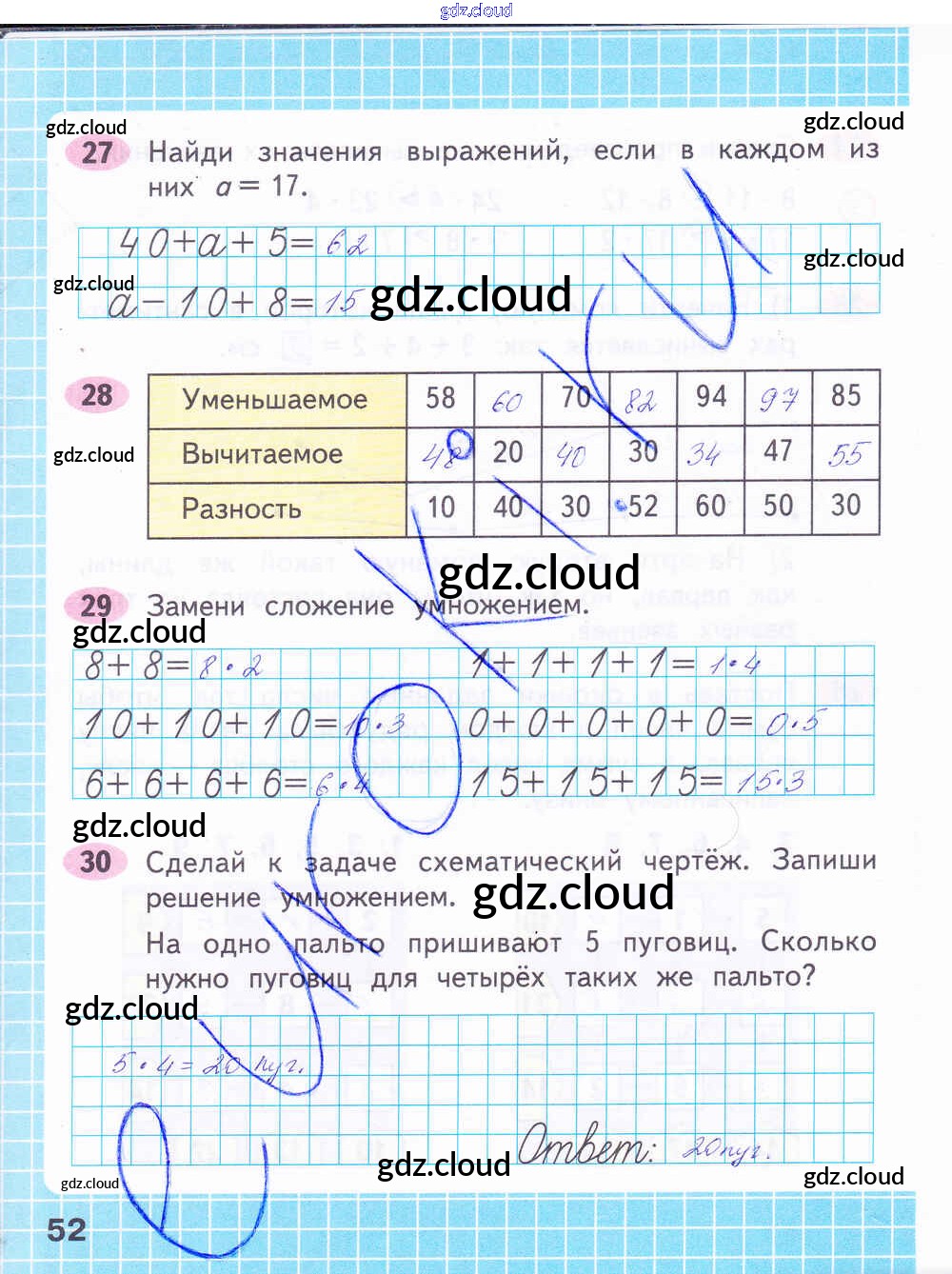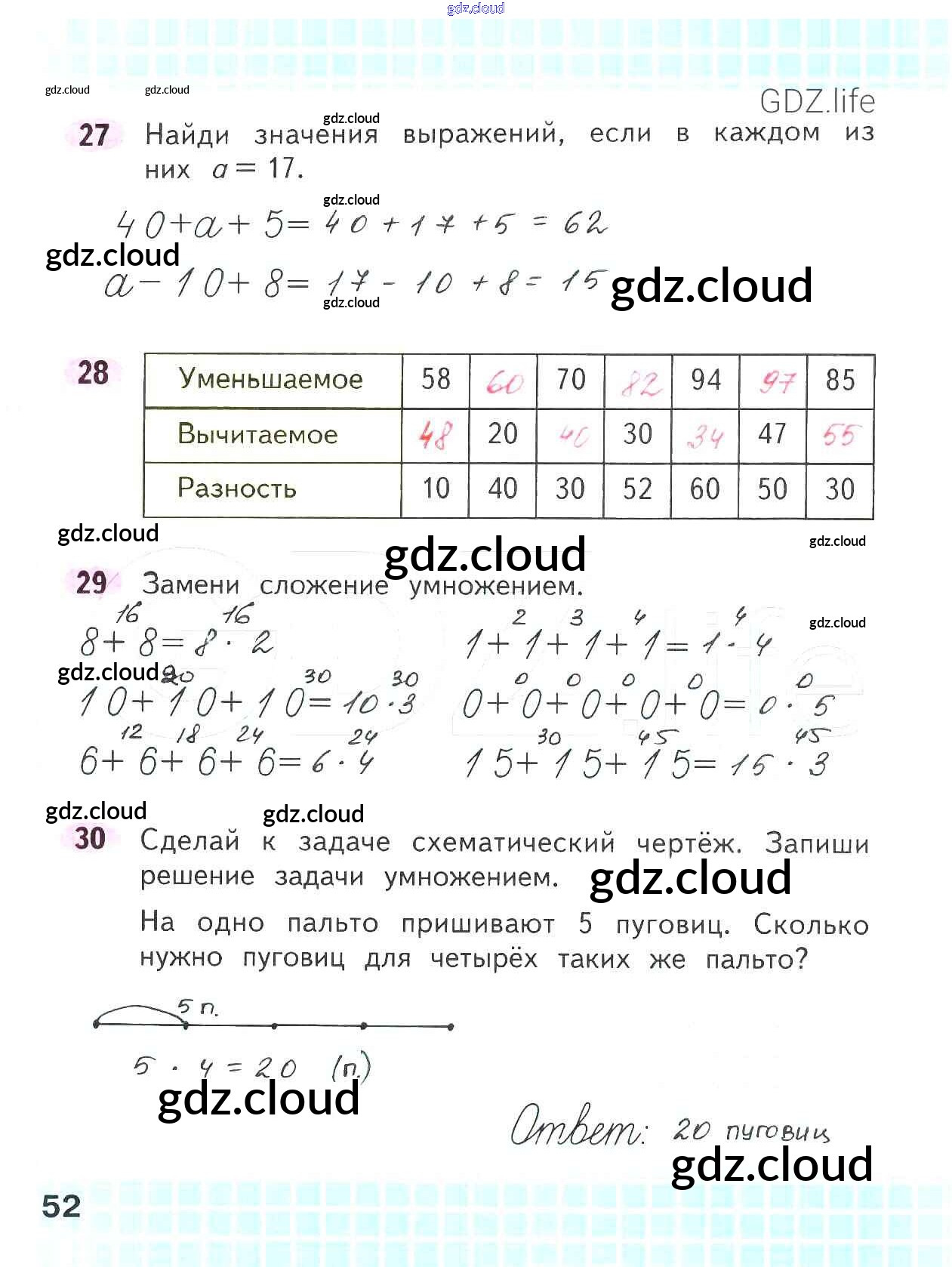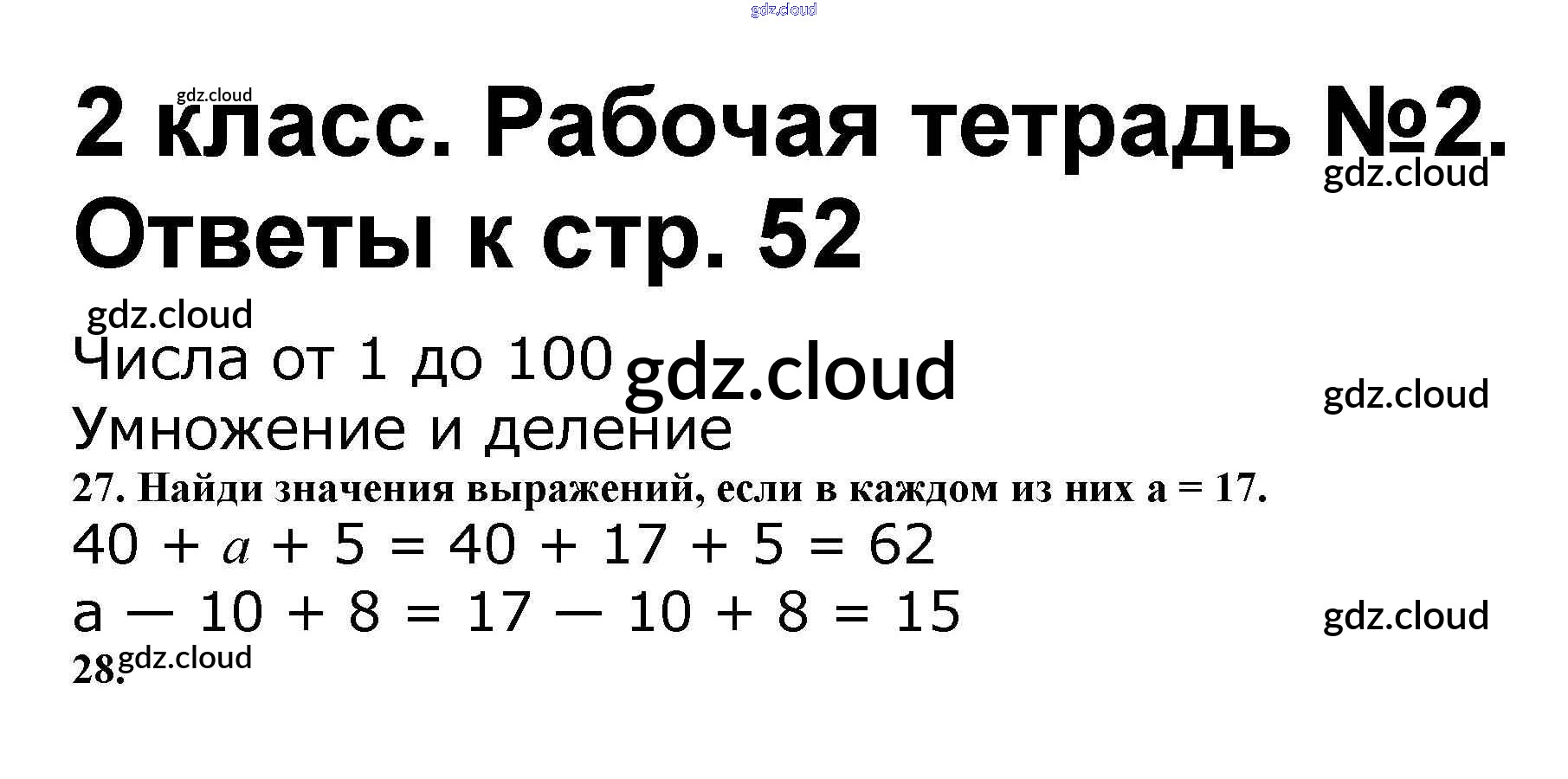 Ответ на задание стр.52 Рабочая тетрадь Математика за 2 (второй) класс Волкова, Моро Школа России 2016 Часть 1, 2