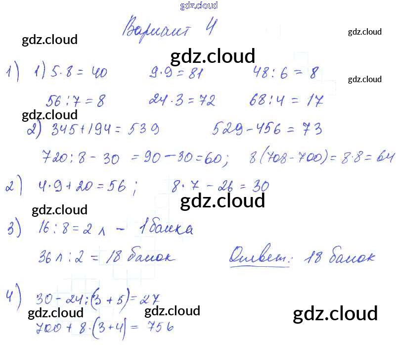 Ответ на задание Вариант 4 Контрольные работы Математика за 1, 2, 3, 4 (первый, второй, третий, четвертый) класс Волкова Школа России 2017