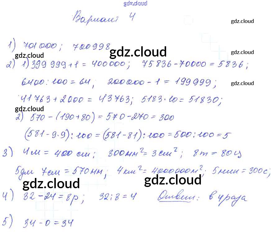 Ответ на задание Вариант 4 Контрольные работы Математика за 1, 2, 3, 4 (первый, второй, третий, четвертый) класс Волкова Школа России 2017