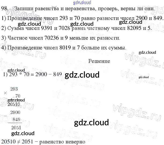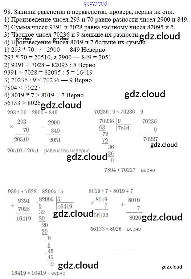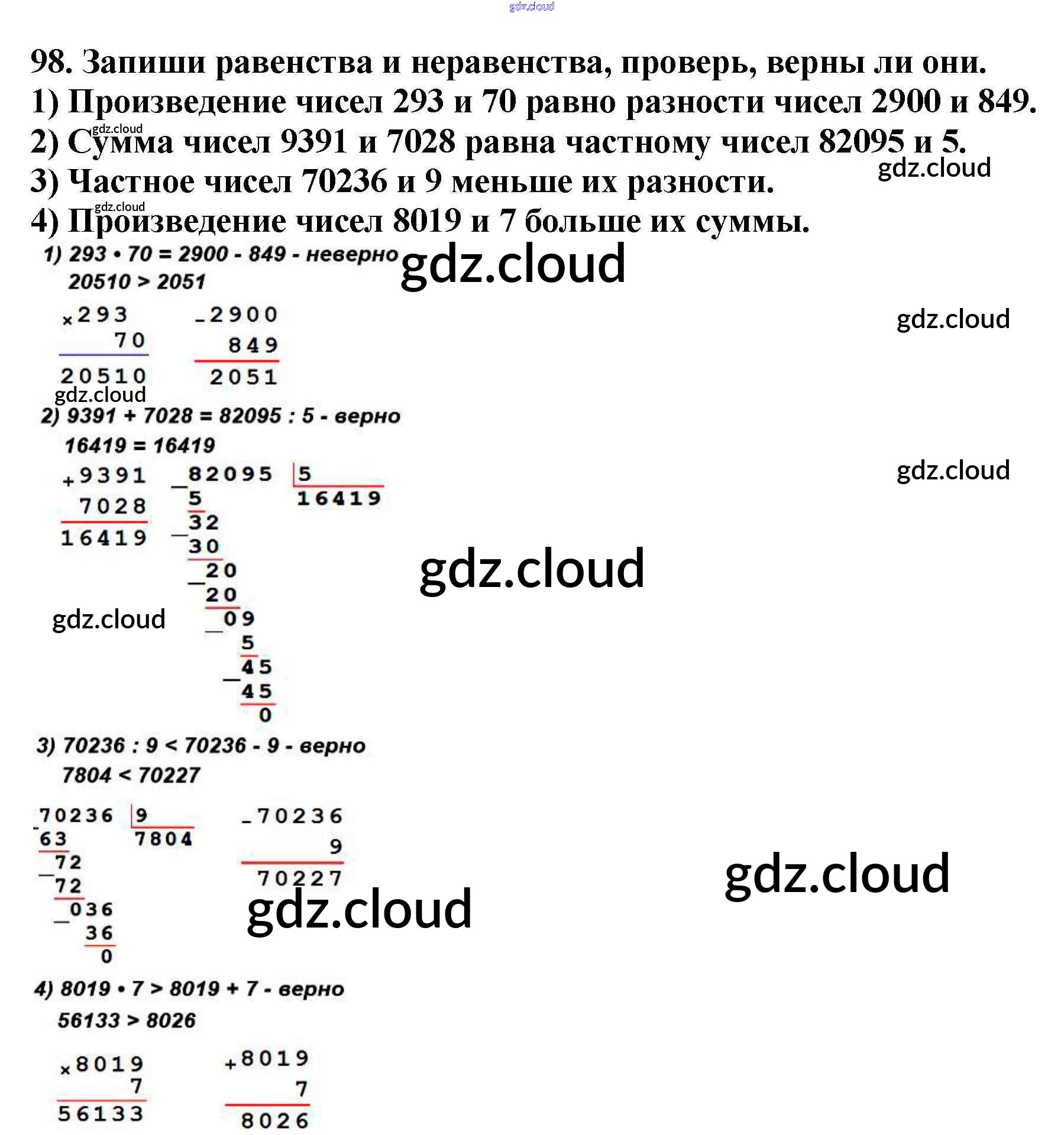 Ответ на задание 98 Учебник Математика за 4 (четвертый) класс Моро, Бантова, Бельтюкова, Волкова, Степанова Школа России 2015 Часть 1, 2