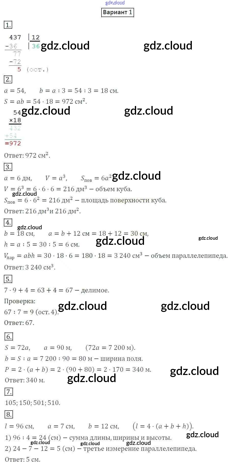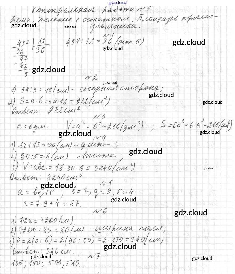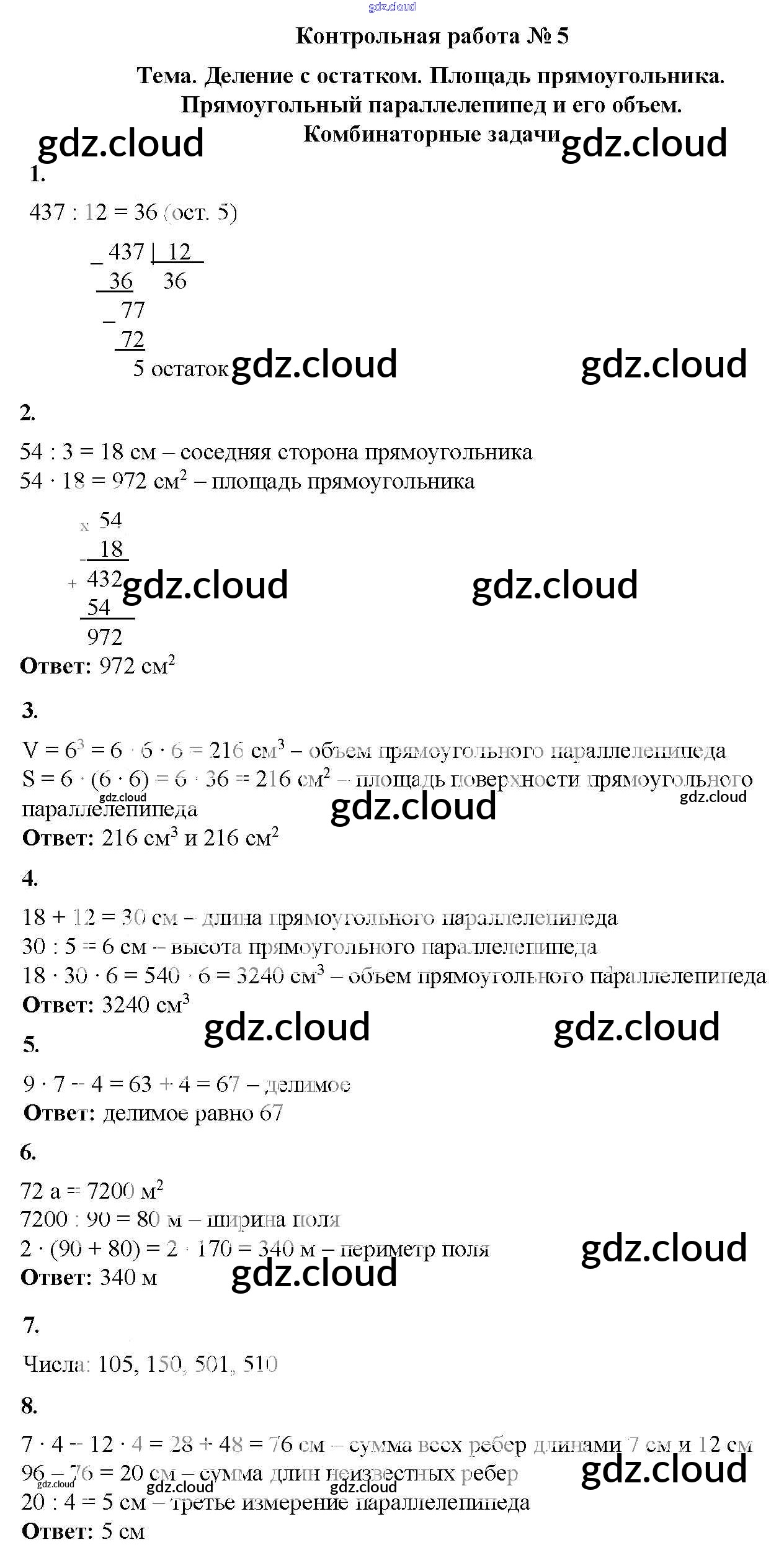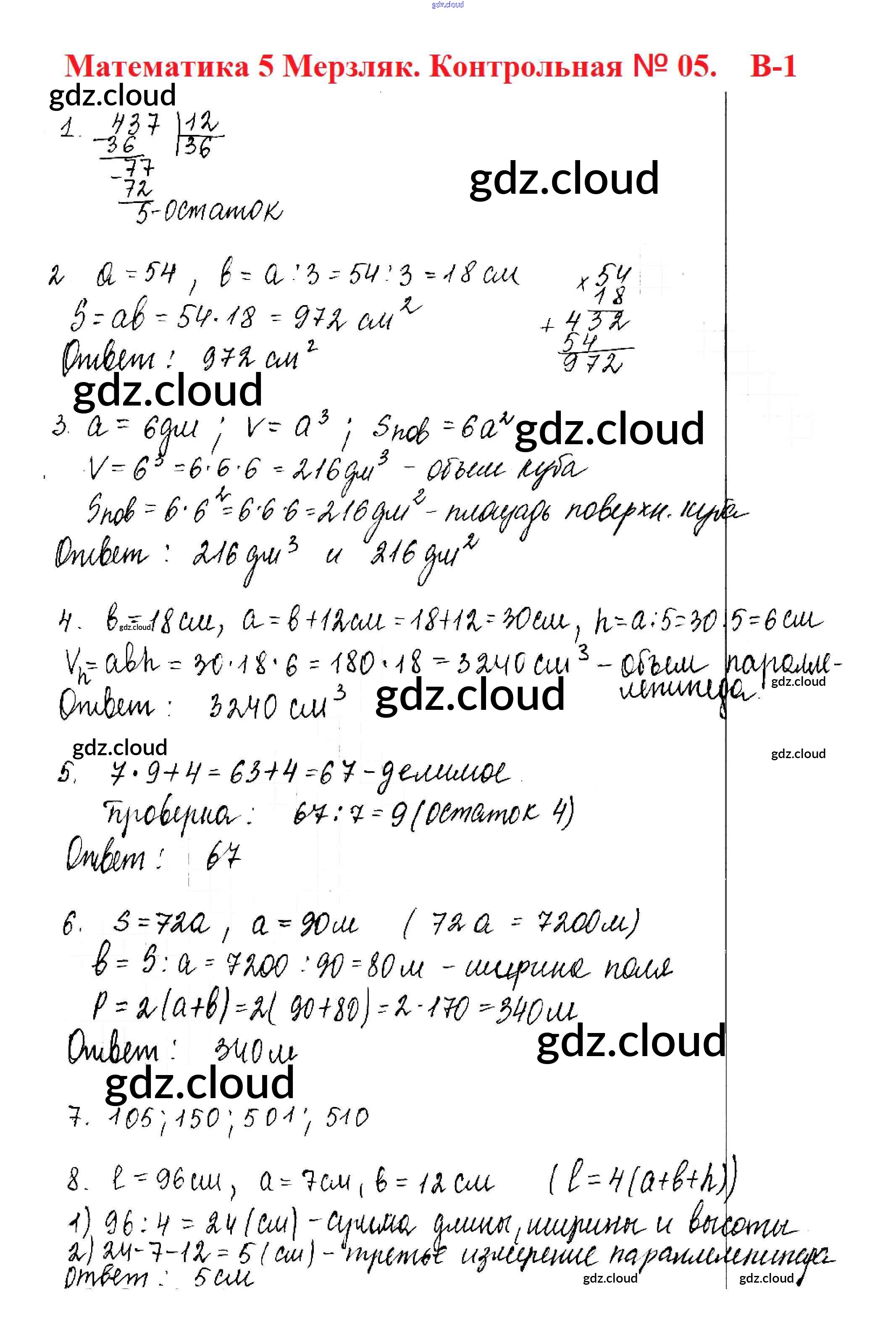 КР №5. Деление с остатком. Площадь прямоугольника Ответы к контрольным работам по Математике 5 класс Дидактические материалы Мерзляк Алгоритм успеха Вентана-граф