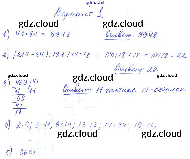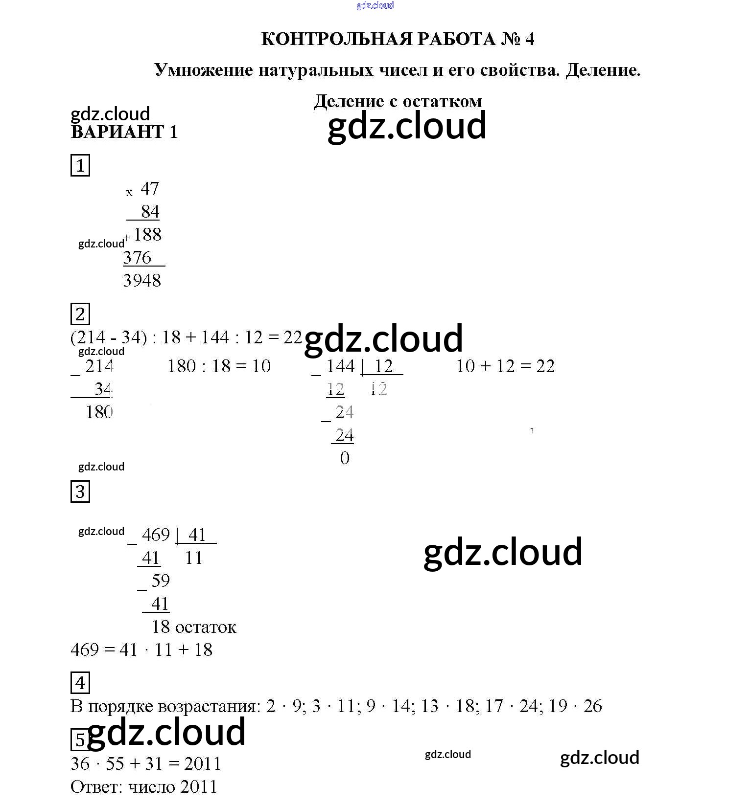 КР №4. Умножение натуральных чисел и его свойства. Деление. Деление с остатком Ответы к Контрольным работам по Математике 5 класс Дидактические материалы Попов УМК Экзамен