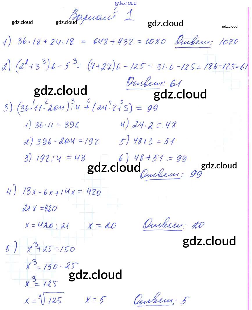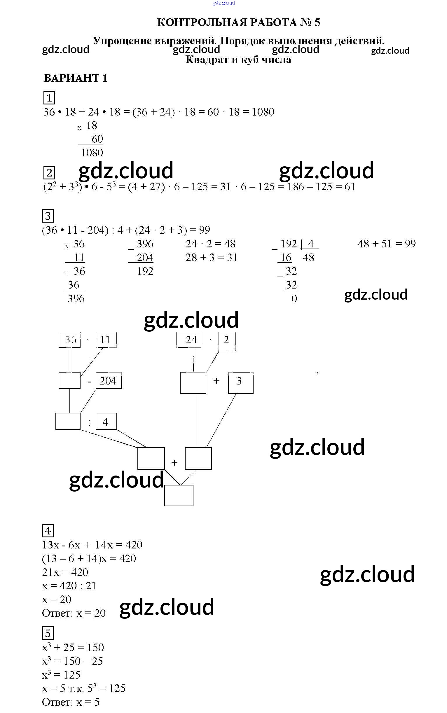 КР №5. Упрощение выражений. Порядок выполнения действий. Квадрат и куб числа Ответы к Контрольным работам по Математике 5 класс Дидактические материалы Попов УМК Экзамен