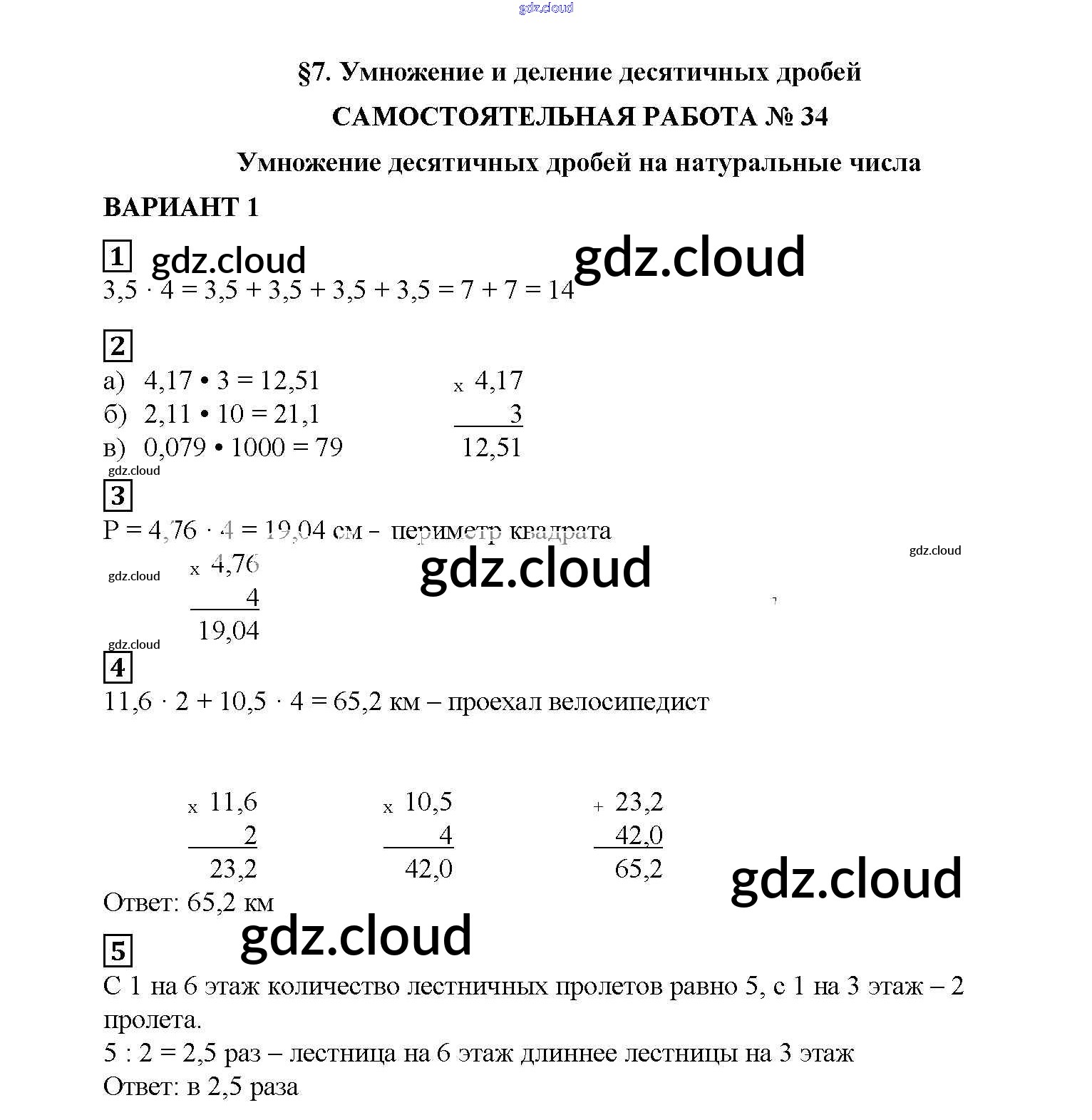 СР №34. Умножение десятичных дробей на натуральные числа Ответы к Самостоятельным работам по Математике 5 класс Дидактические материалы Попов УМК Экзамен