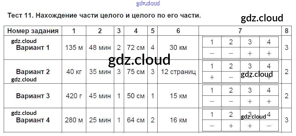 Ответ на задание Тест №11. Нахождение части целого и целого по его части Тематические тесты Математика за 5 (пятый) класс Кузнецова, Минаева, Рослова, Суворова 2018