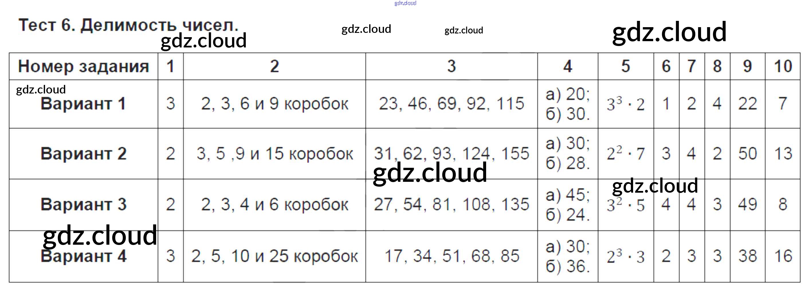 Ответ на задание Тест №6. Делимость чисел Тематические тесты Математика за 5 (пятый) класс Кузнецова, Минаева, Рослова, Суворова 2018