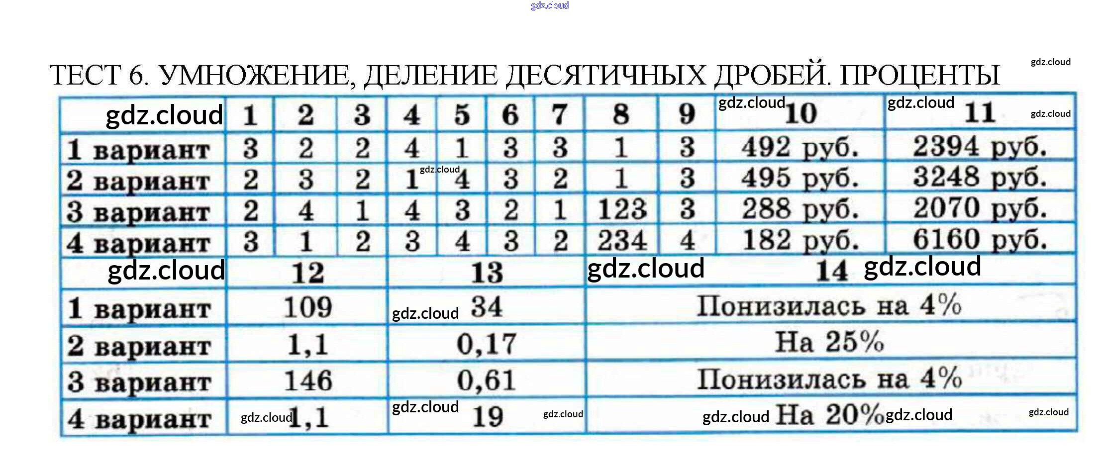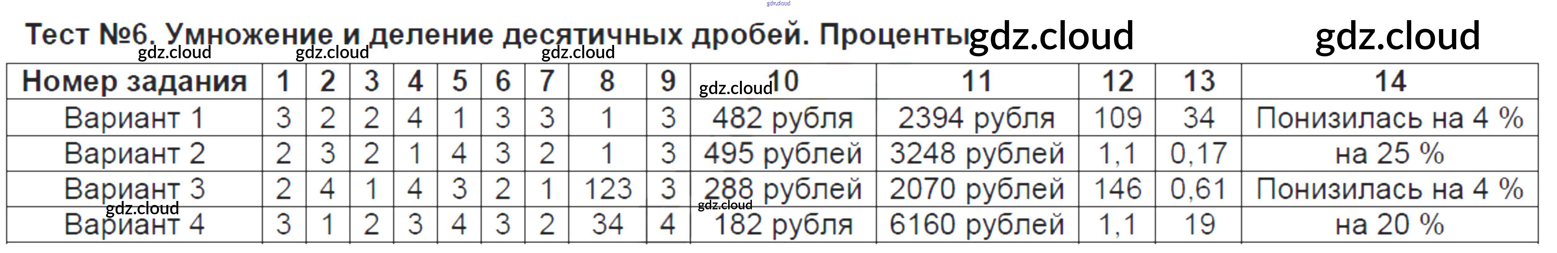 Ответ на задание Тест №6. Умножение и деление десятичных дробей. Проценты Тесты Математика за 5 (пятый) класс Ерина УМК 2017