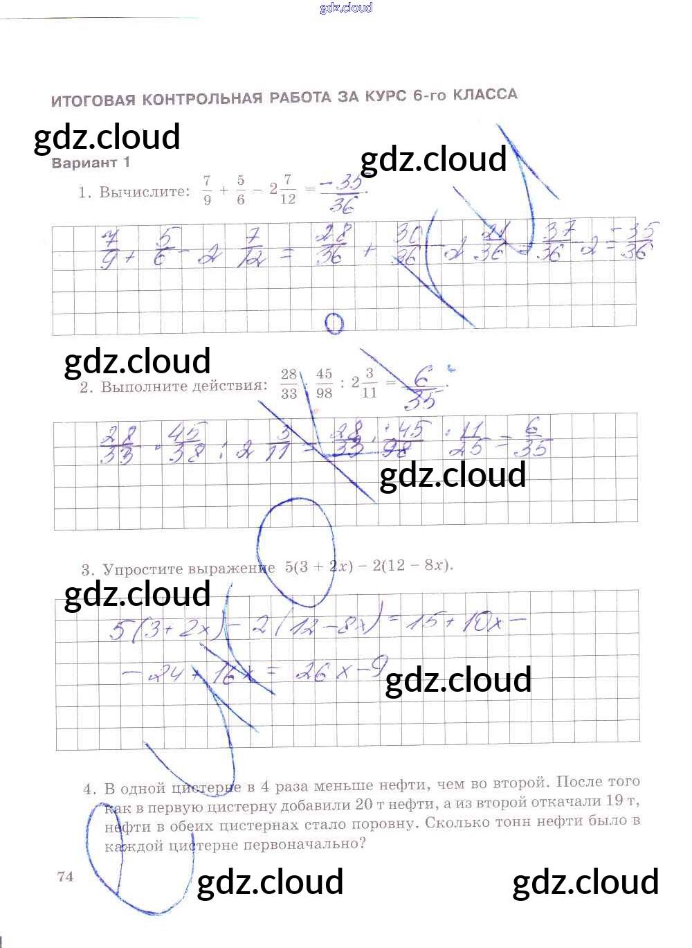 Ответ на задание стр.74 Тетрадь для контрольных работ Математика за 6 (шестой) класс Зубарева, Лепешонкова 2020 Часть 1, 2