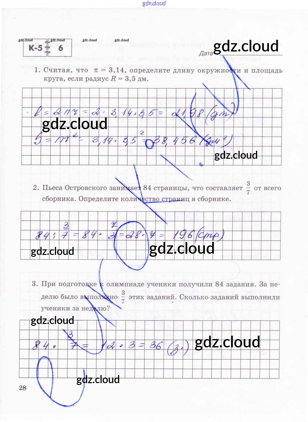 Ответ на задание стр.28 Тетрадь для контрольных работ Математика за 6 (шестой) класс Зубарева, Лепешонкова 2020 Часть 1, 2