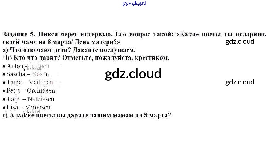 Раздел 3. Мы поздравляем наших мам с Женским днём Ответы к главе 5. Наступила весна. И с ней замечательные праздника, не так ли по Немецкому языку 3 класс Учебник Бим Часть 1, 2 Просвещение