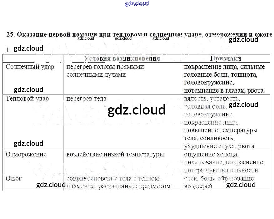 Ответы к теме: 25. Оказание первой помощи при тепловом и солнечном ударе, отморожении и ожоге по ОБЖ 6 класс Рабочая тетрадь Егорова Лицей