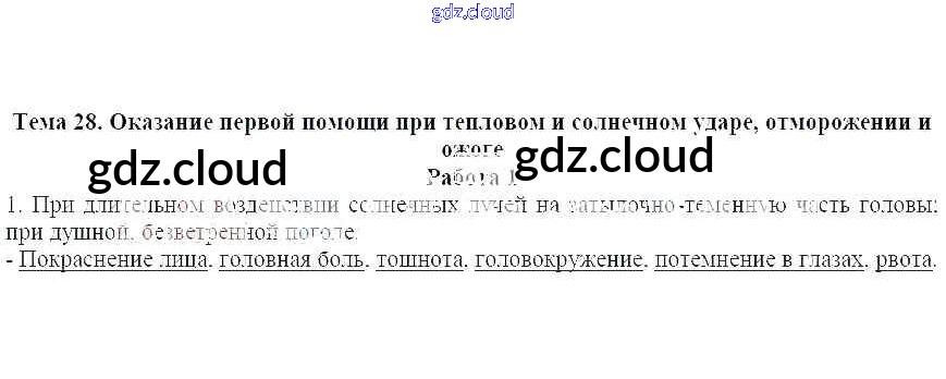 Работа 1 Ответы к теме: 28. Оказание первой помощи при тепловом и солнечном ударе, отморожении и ожоге по ОБЖ 6 класс Рабочая тетрадь Демидов Лицей