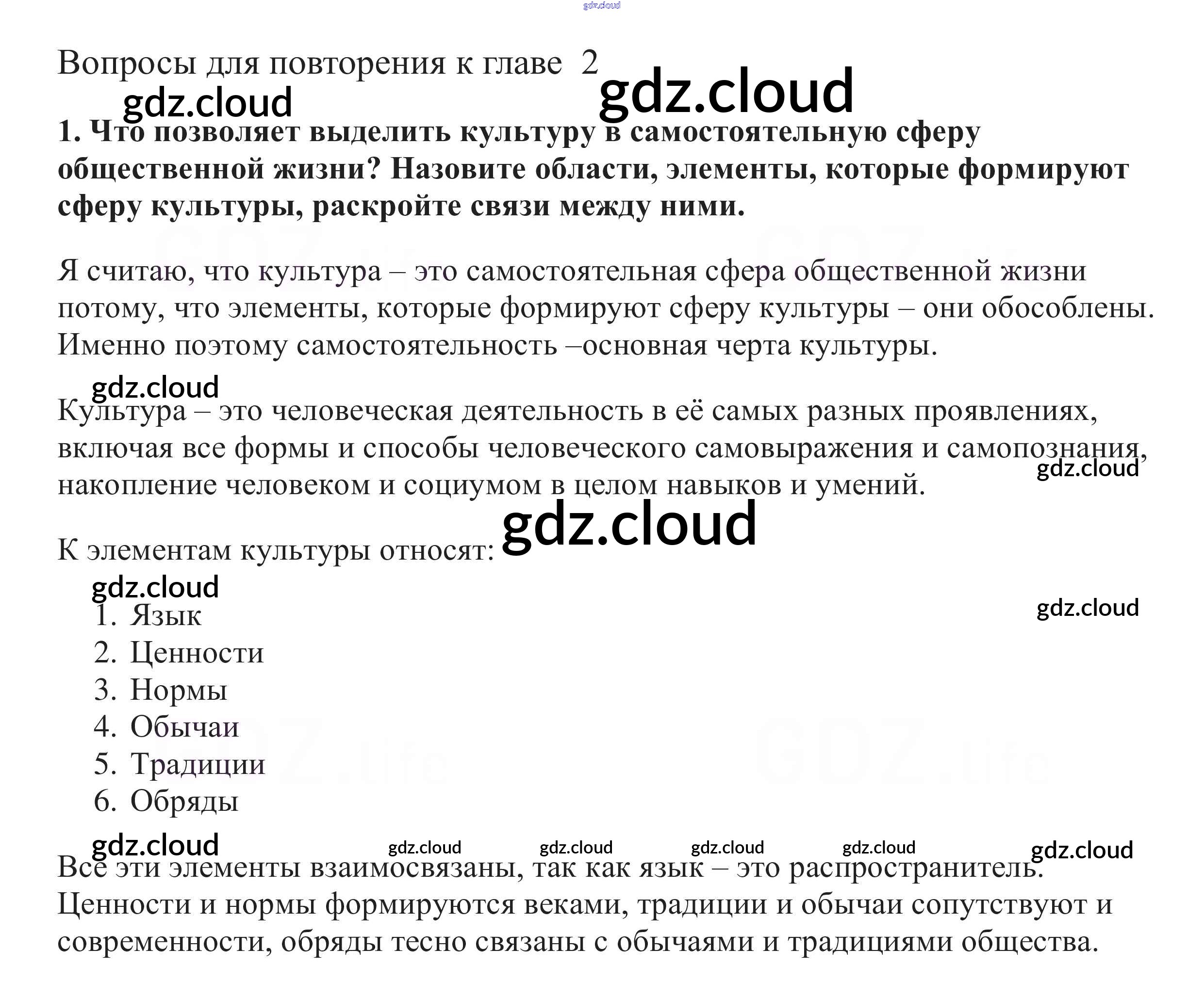 Вопросы для повторения к главе 2 страница 173 Ответы к главе 2. Общество как мир культуры по Обществознанию 10 класс Учебник Боголюбов Базовый уровень Просвещение