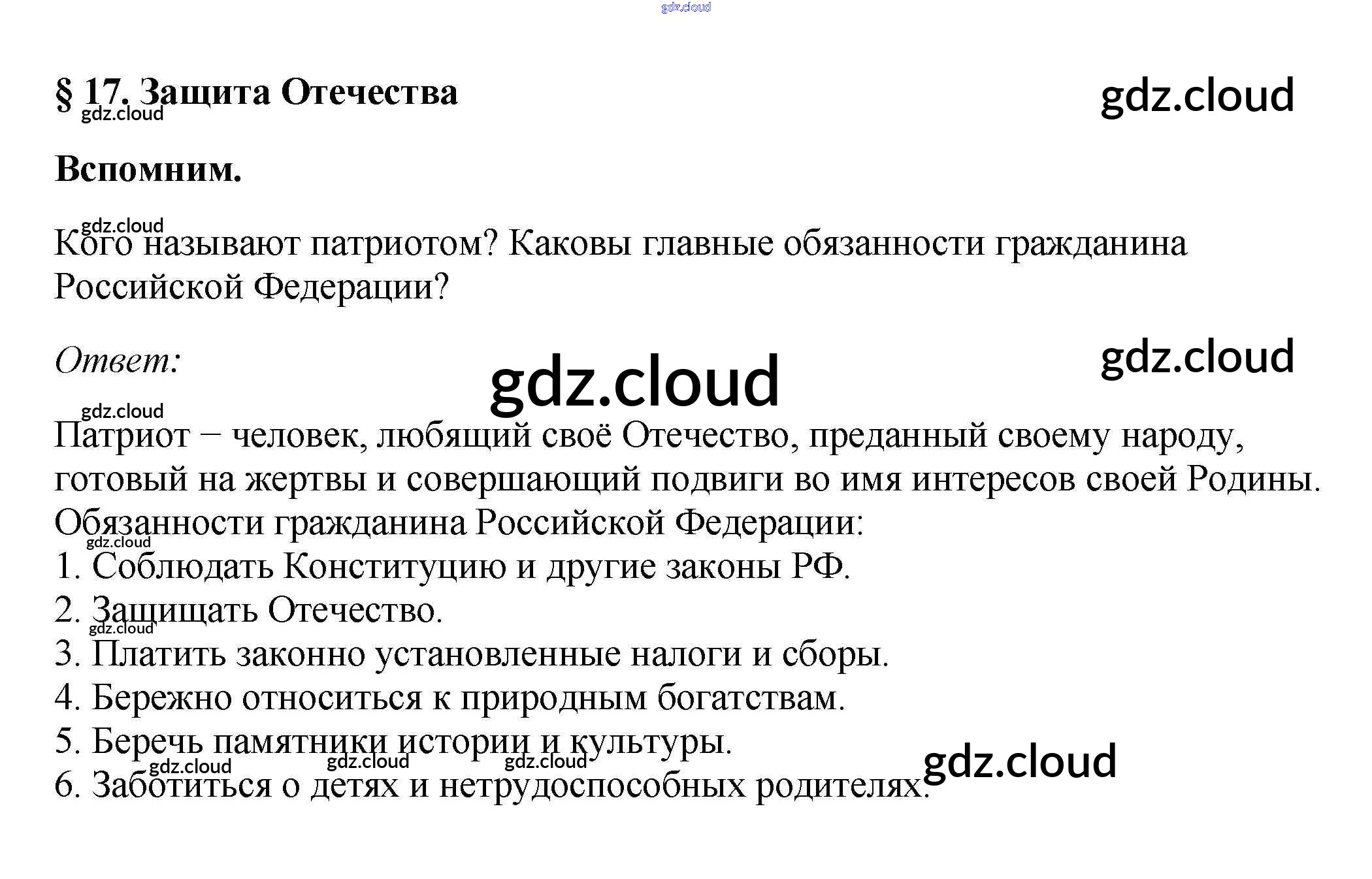 Вспомним §17. Защита Отечества по Обществознанию 7 класс Учебник Боголюбов Академический школьный учебник Просвещение, Просвещение