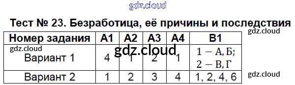 Ответ на задание Тест №23. Безработица, её причины и последствия Контрольно-измерительные материалы (КИМ) Обществознание за 8 (восьмой) класс Поздеев 2017
