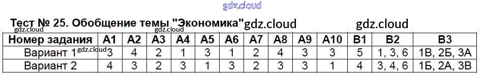Ответ на задание Тест №25. Обобщение темы - Экономика Контрольно-измерительные материалы (КИМ) Обществознание за 8 (восьмой) класс Поздеев 2017