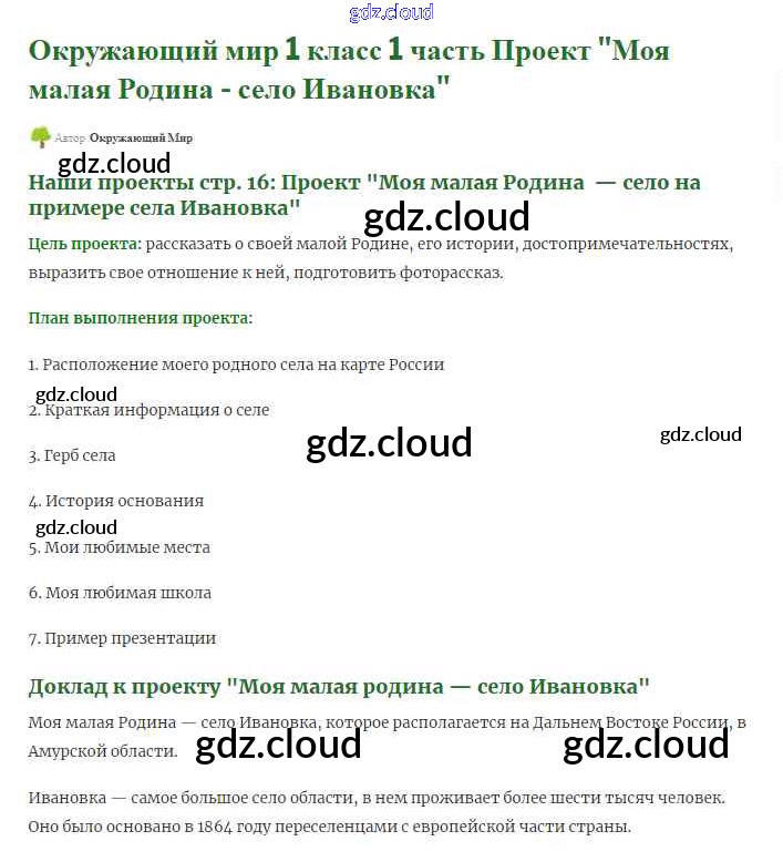Проекты (Моя малая Родина) стр 16 Ответы к части 1 (Страниицы) по Окружающему миру 1 класс Учебник Плешаков Школа России Часть 1, 2 Просвещение