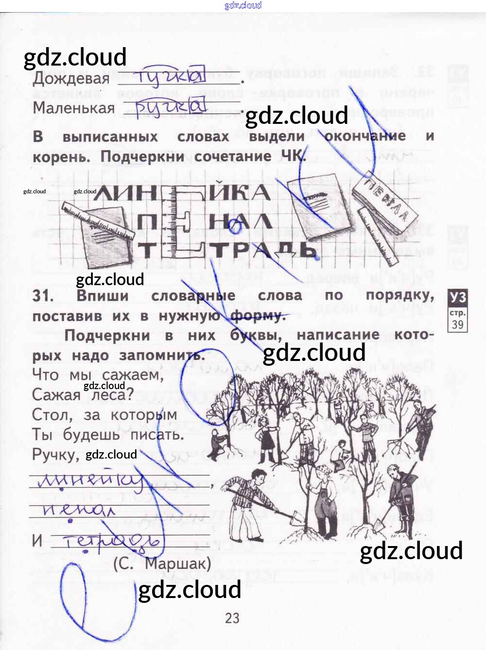 Ответ на задание 23 Тетрадь для самостоятельной работы Русский язык за 2 (второй) класс Байкова, Малаховская, Гольфман 2017 Часть 1, 2
