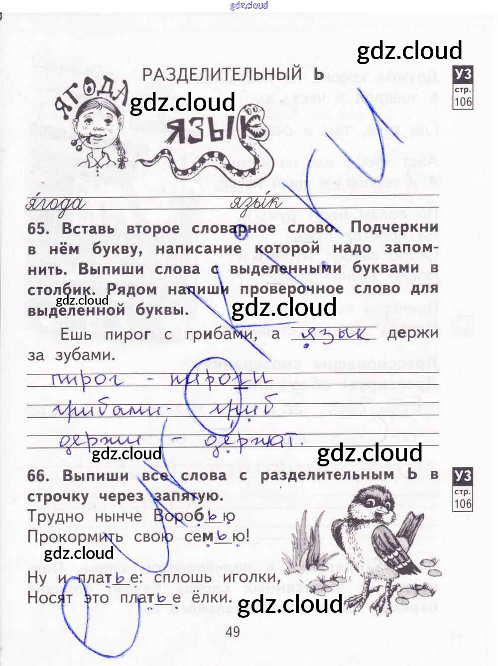 Ответ на задание 49 Тетрадь для самостоятельной работы Русский язык за 2 (второй) класс Байкова, Малаховская, Гольфман 2017 Часть 1, 2