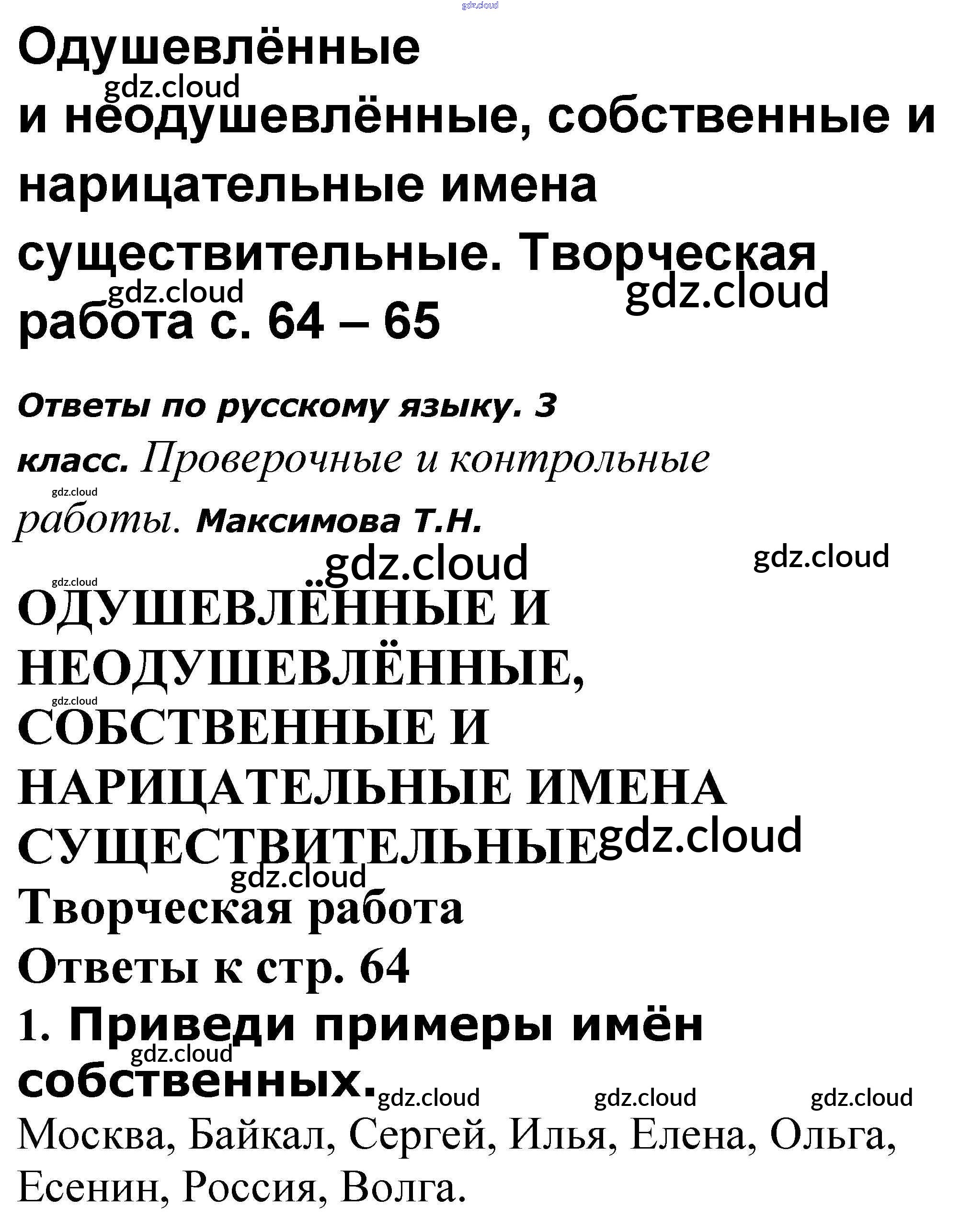 Ответы к теме: Одушевлённые и неодушевлённые, собственные и нарицательные имена существительные по Русскому языку 3 класс Проверочные и контрольные работы Максимова ВАКО