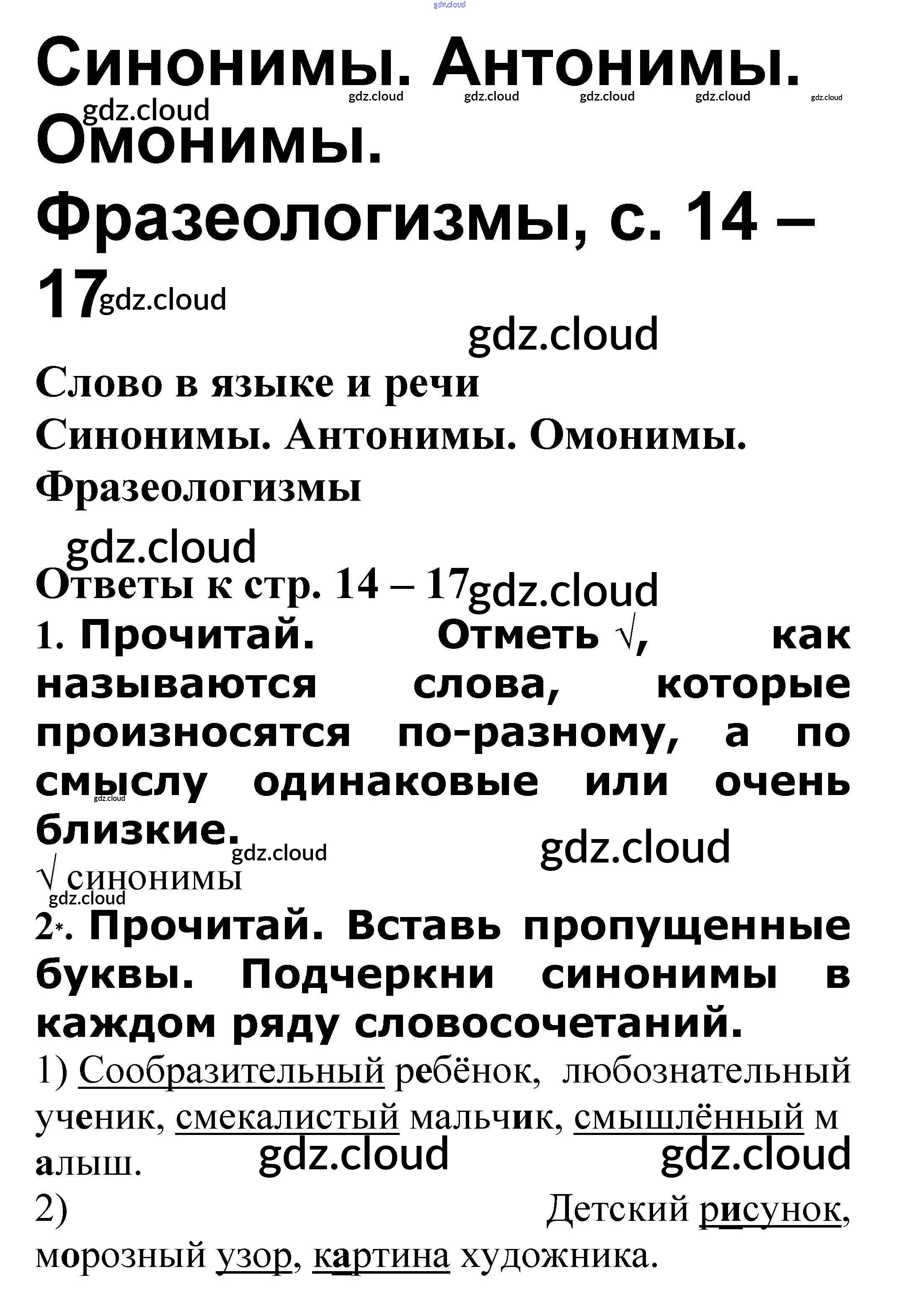 Ответ на задание Синонимы. Антонимы. Омонимы. Фразеологизмы стр. 14 – 17 Проверочные работы Русский язык за 3 (третий) класс Канакина, Щеголева Школа России 2018