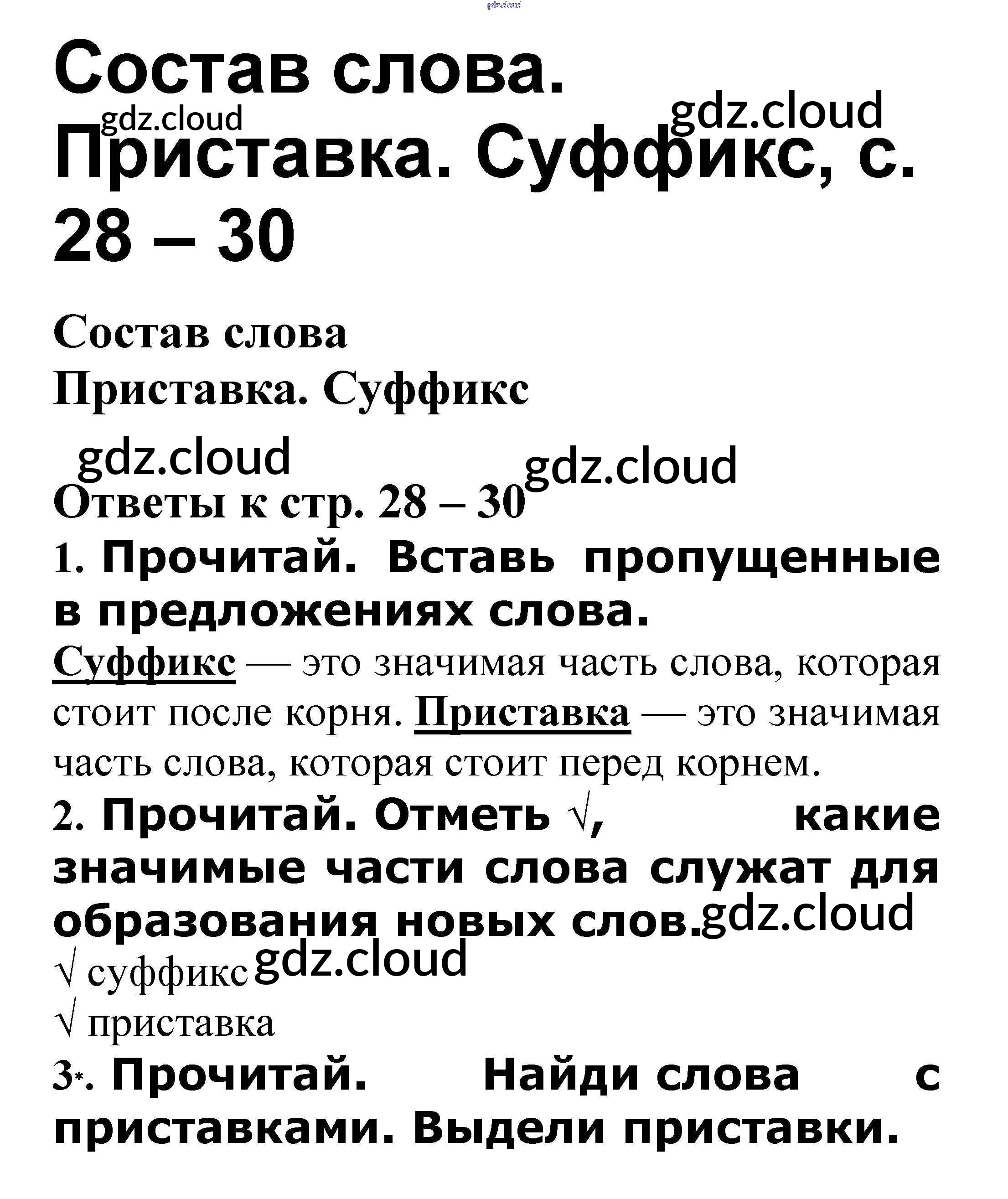 Ответ на задание Приставка. Суффикс стр. 28 – 30 Проверочные работы Русский язык за 3 (третий) класс Канакина, Щеголева Школа России 2018