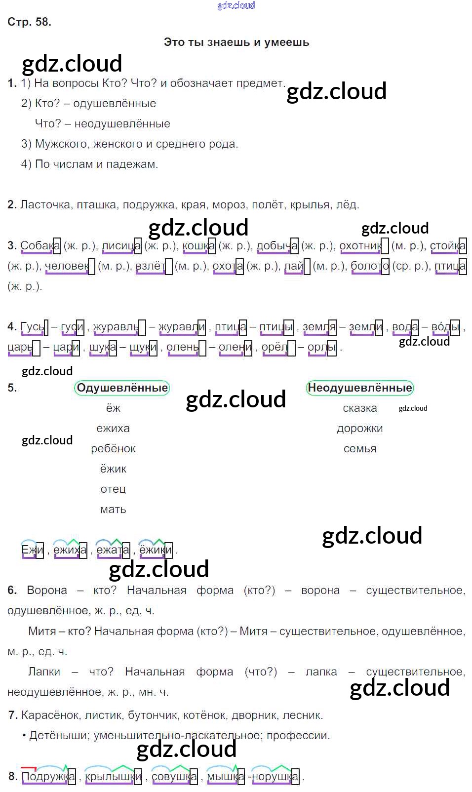 Ответ на задание стр.58 Учебник Русский язык за 3 (третий) класс Бунеев, Бунеева, Пронина Школа 2100 2015 Часть 1, 2
