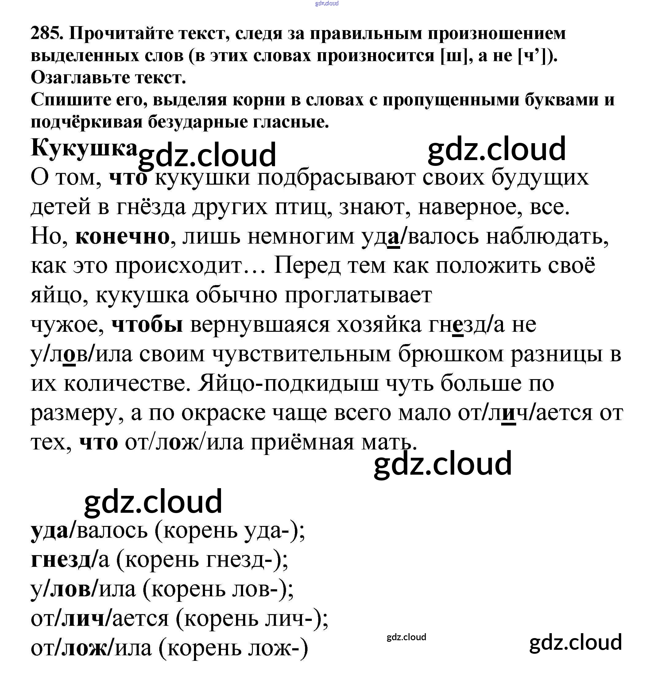 Ответ на задание 285 Учебник Русский язык за 5 (пятый) класс Баранов, Ладыженская, Тростенцова, Кулибаба, Григорян 2016, 2019 Часть 1, 2