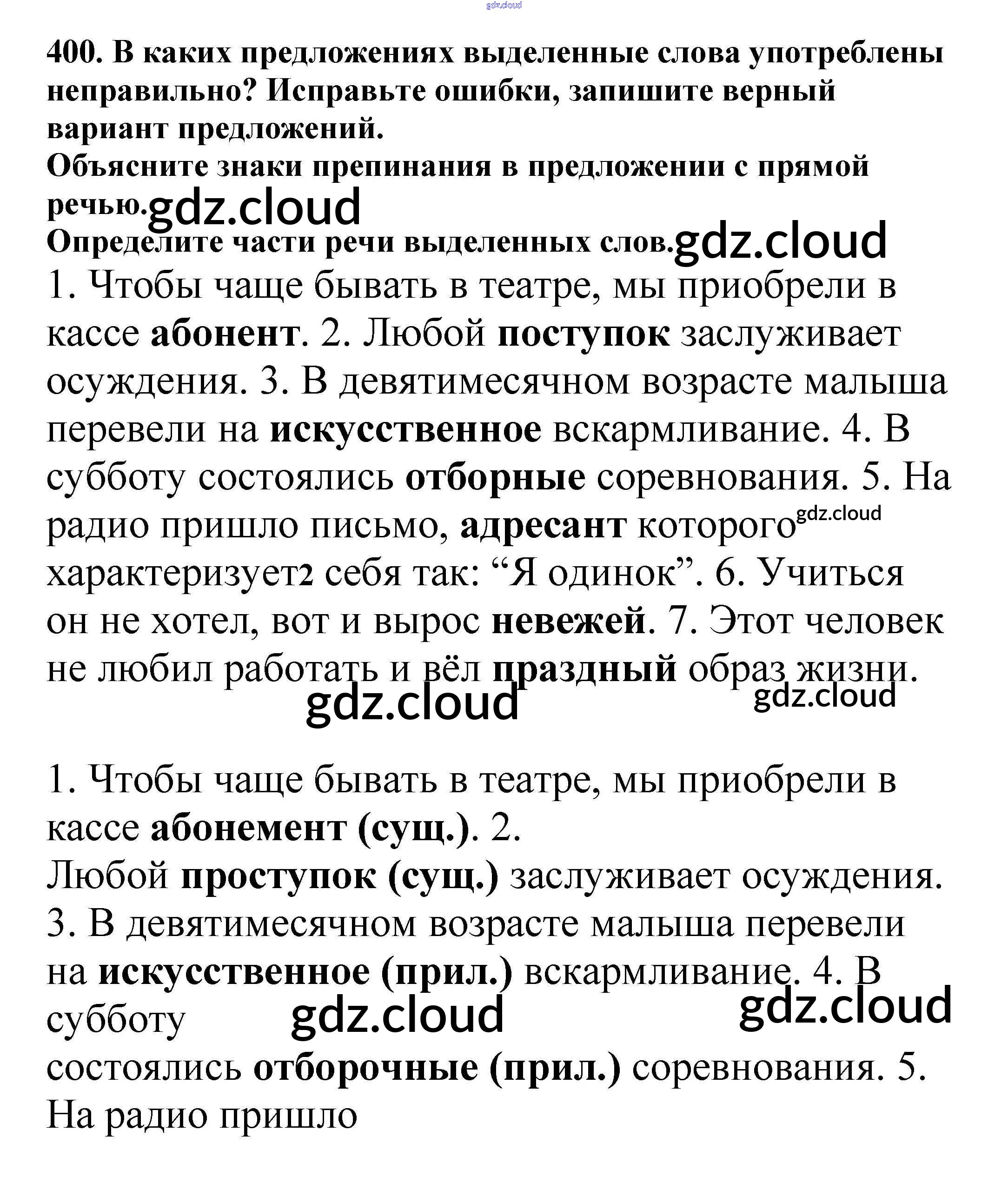 Ответ на задание 400 Учебник Русский язык за 5 (пятый) класс Баранов, Ладыженская, Тростенцова, Кулибаба, Григорян 2016, 2019 Часть 1, 2
