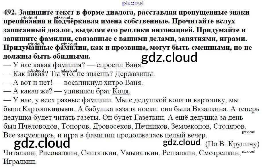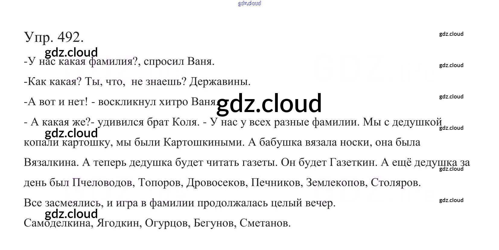 Ответ на задание 492 Учебник Русский язык за 5 (пятый) класс Баранов, Ладыженская, Тростенцова, Кулибаба, Григорян 2016, 2019 Часть 1, 2