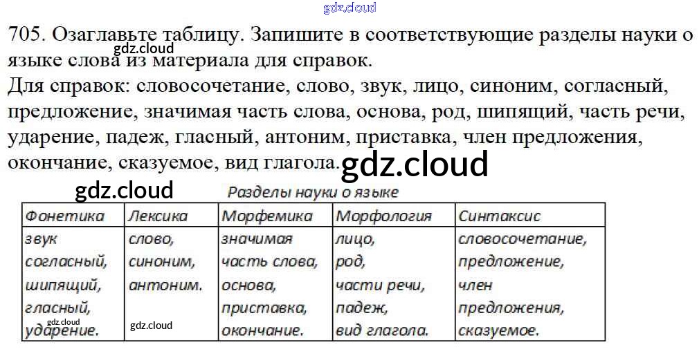 Ответ на задание 705 Учебник Русский язык за 5 (пятый) класс Баранов, Ладыженская, Тростенцова, Кулибаба, Григорян 2016, 2019 Часть 1, 2