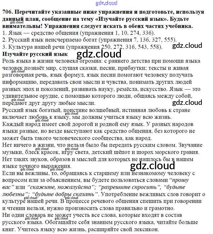 Ответ на задание 706 Учебник Русский язык за 5 (пятый) класс Баранов, Ладыженская, Тростенцова, Кулибаба, Григорян 2016, 2019 Часть 1, 2