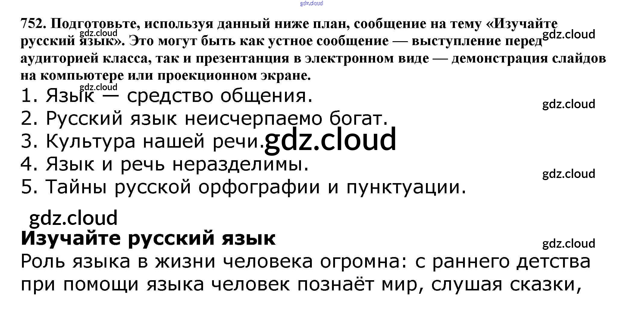 Ответ на задание 752 Учебник Русский язык за 5 (пятый) класс Баранов, Ладыженская, Тростенцова, Кулибаба, Григорян 2016, 2019 Часть 1, 2