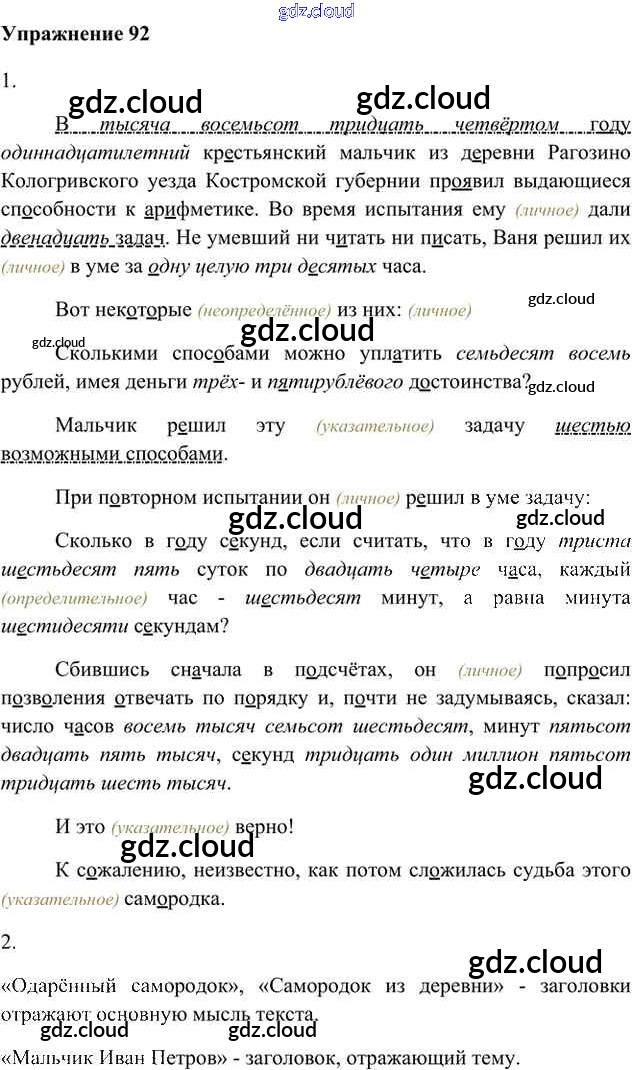 Ответ на задание 92 Учебник Русский язык за 6 (шестой) класс Быстрова, Кибирева, Гостева Инновационная школа 2016 Часть 1, 2