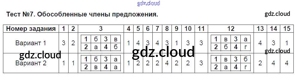 Ответ на задание Тест №7. Обособленные члены предложения Тематические тесты Русский язык за 8 (восьмой) класс Клевцова, Шубукина УМК 2018