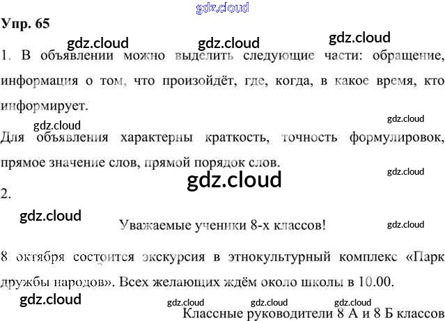 Ответ на задание 65 Учебник Русский язык за 8 (восьмой) класс Быстрова, Кибирева, Воителева Инновационная школа 2019 Часть 1, 2