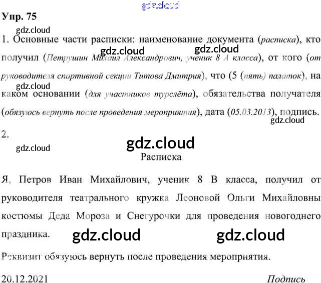 Ответ на задание 75 Учебник Русский язык за 8 (восьмой) класс Быстрова, Кибирева, Воителева Инновационная школа 2019 Часть 1, 2
