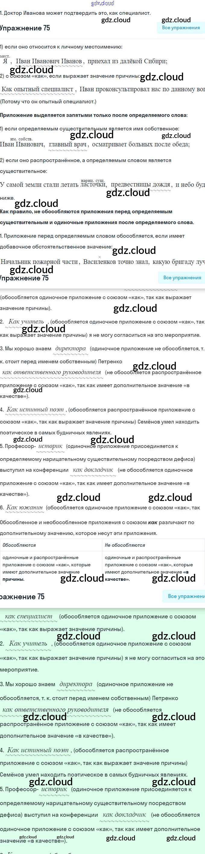 Ответ на задание 75 Учебник Русский язык за 8 (восьмой) класс Шмелёв, Флоренская, Кустова, Шмелёва Алгоритм успеха 2019