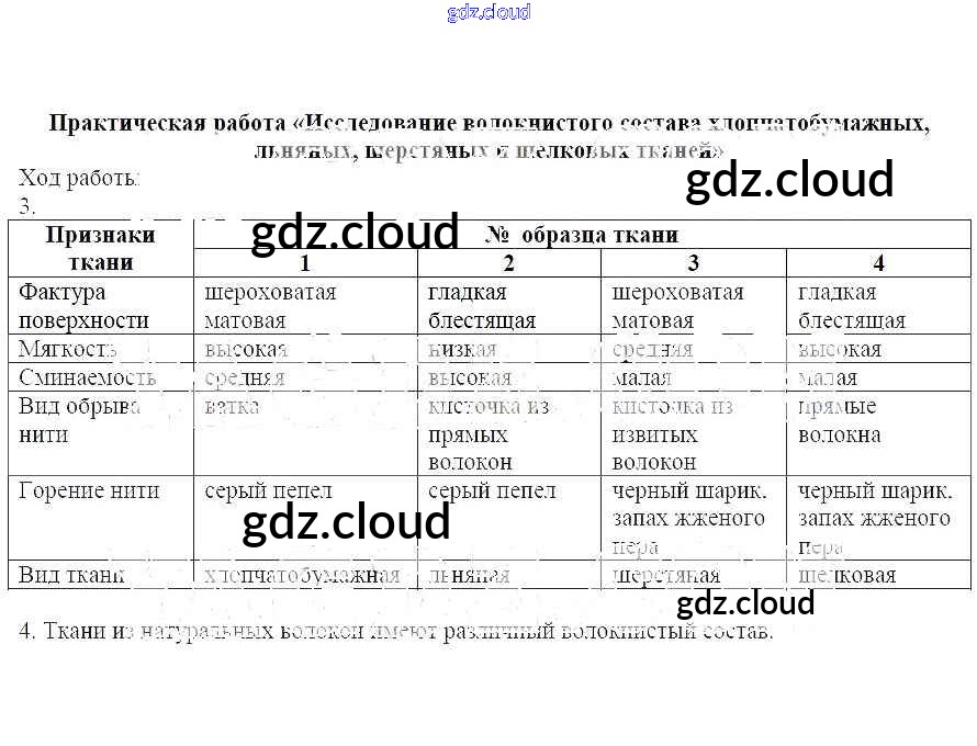 Ответ на задание Практическая работа - Исследование волокнистого состава хлопчатобумажных, льняных, шерстяных и шелковых тканей Рабочая тетрадь Технология за 6 (шестой) класс Кожина, Маркуцкая, Кудакова 2019