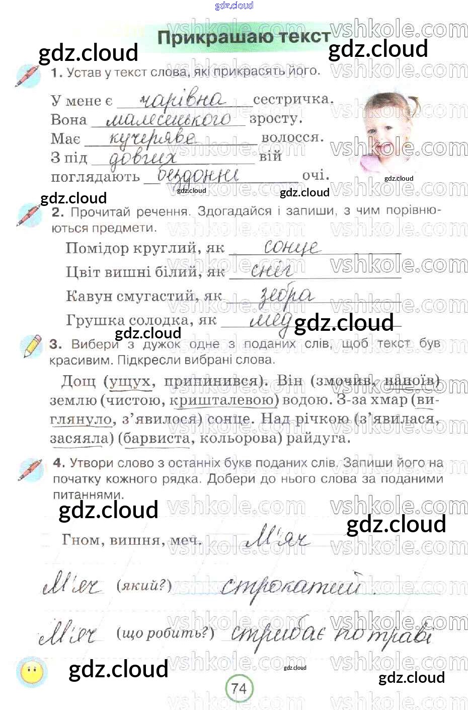 Ответ на задание 74 Рабочая тетрадь Украинский язык за 2 (второй) класс Пономарева 2019 онлайн и без номера телефона.