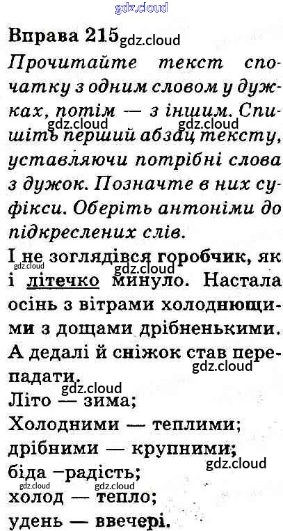 Ответ на задание 215 Учебник Украинский язык за 3 (третий) класс Захарийчук, Мовчун 2013 онлайн и без номера телефона.